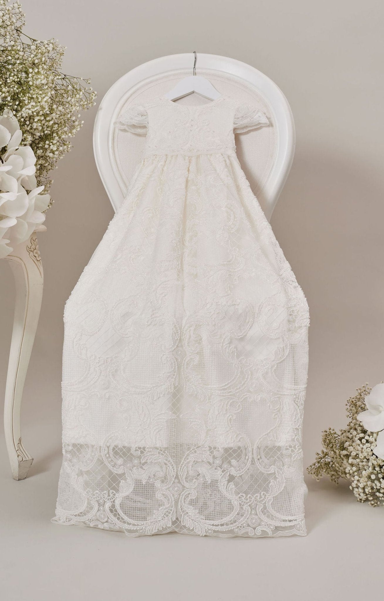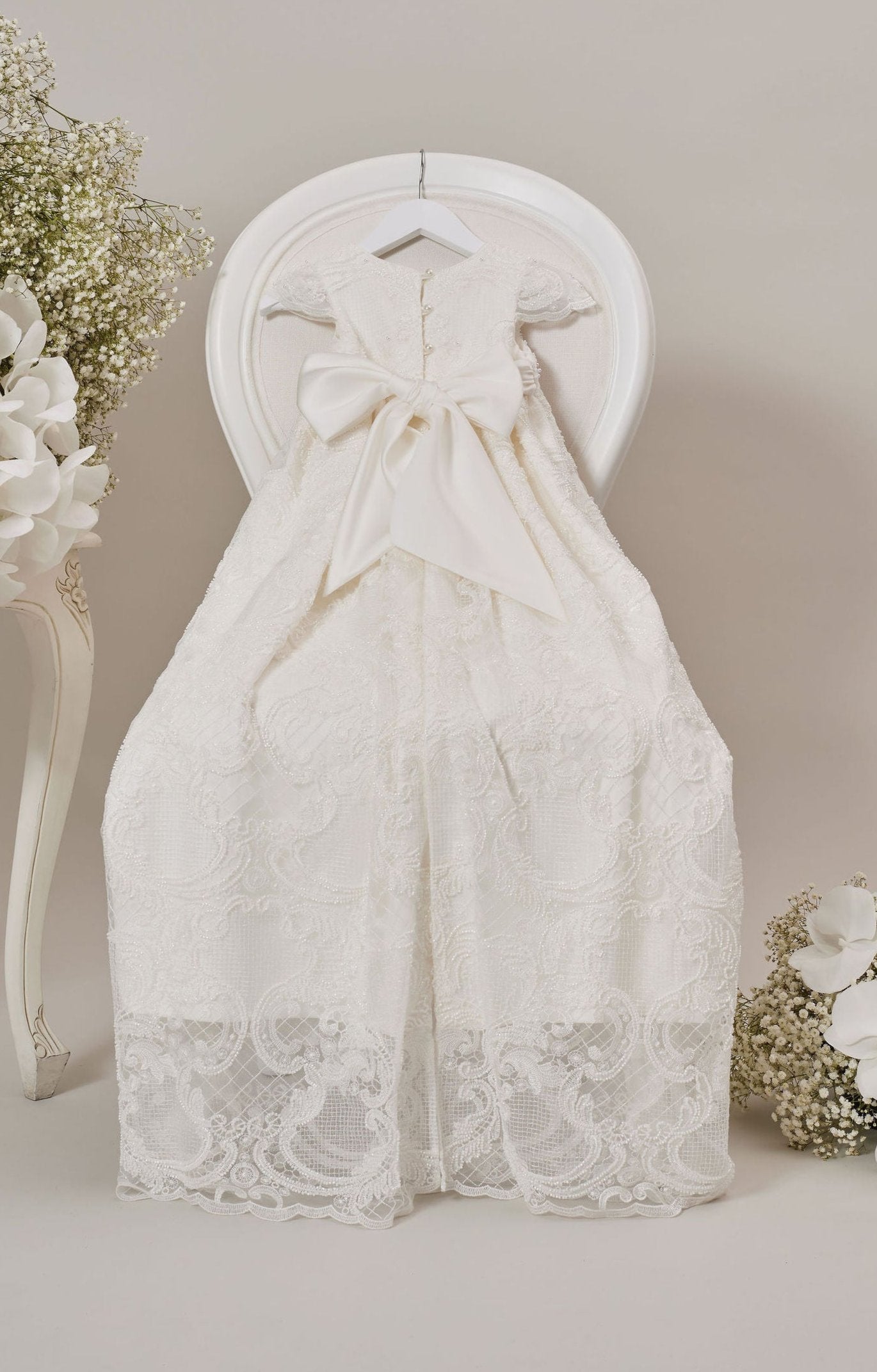 The magnificent Gown is crafted from an intricate pearl and beaded lace, with polyester satin underlay and cotton lining. The gown has cap sleeves, pearl buttons, and a stunning bow sash at the back.