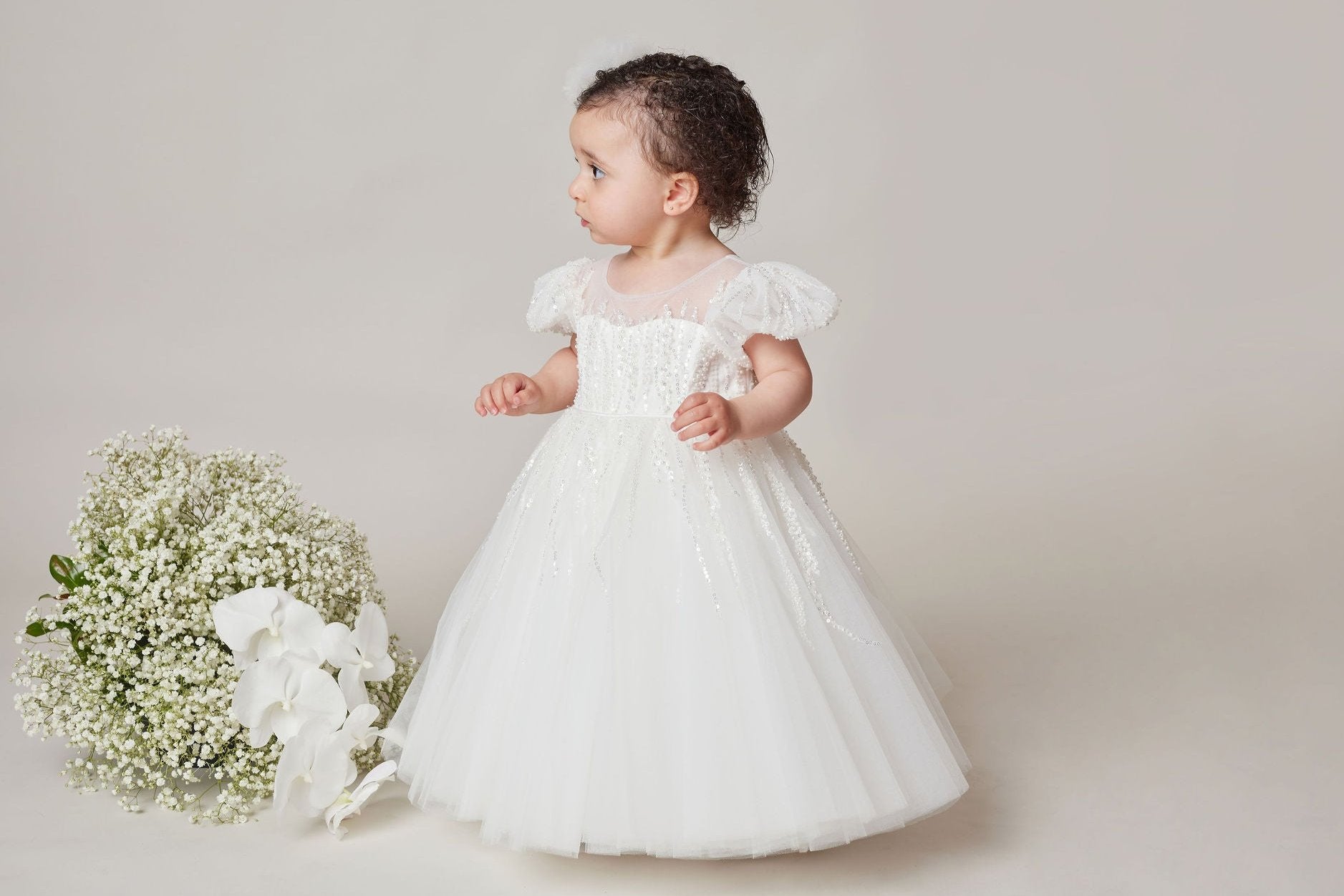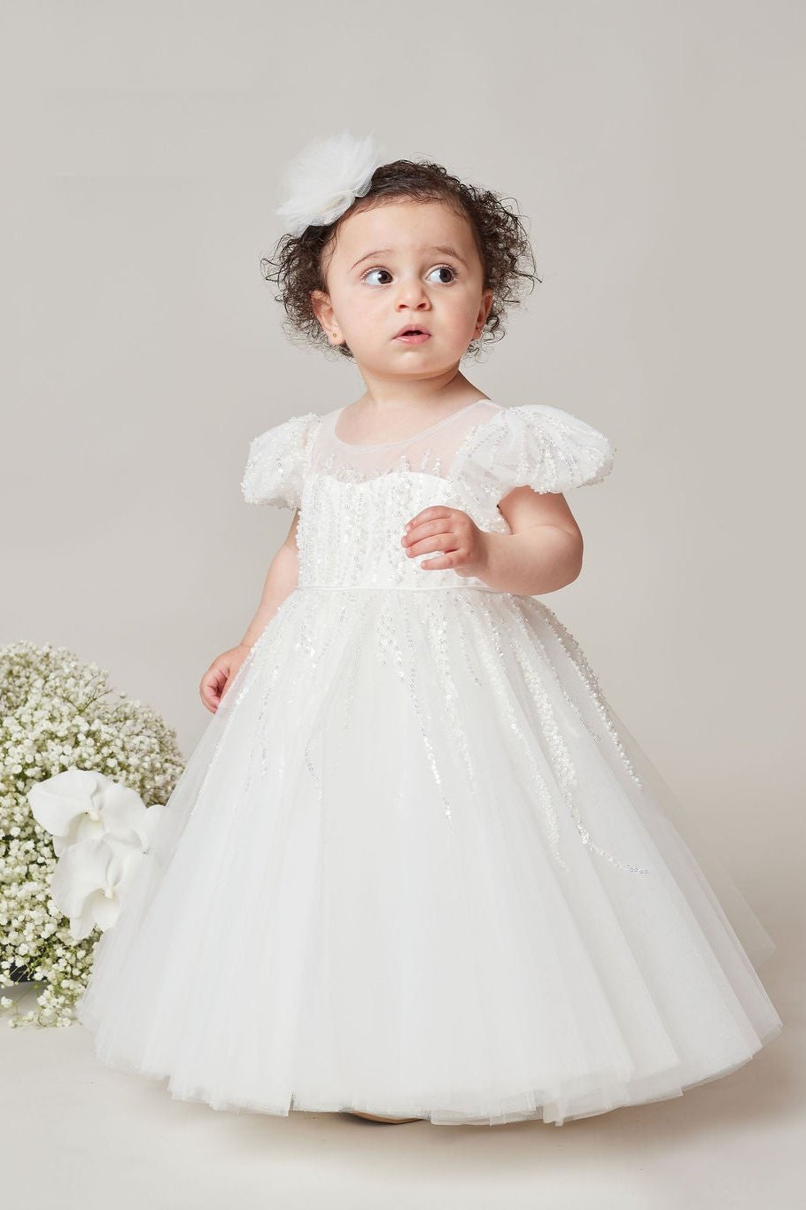 The dress has a gorgeous pearl and beaded lace bodice with illusion neckline, puff sleeves, and tulle skirt.