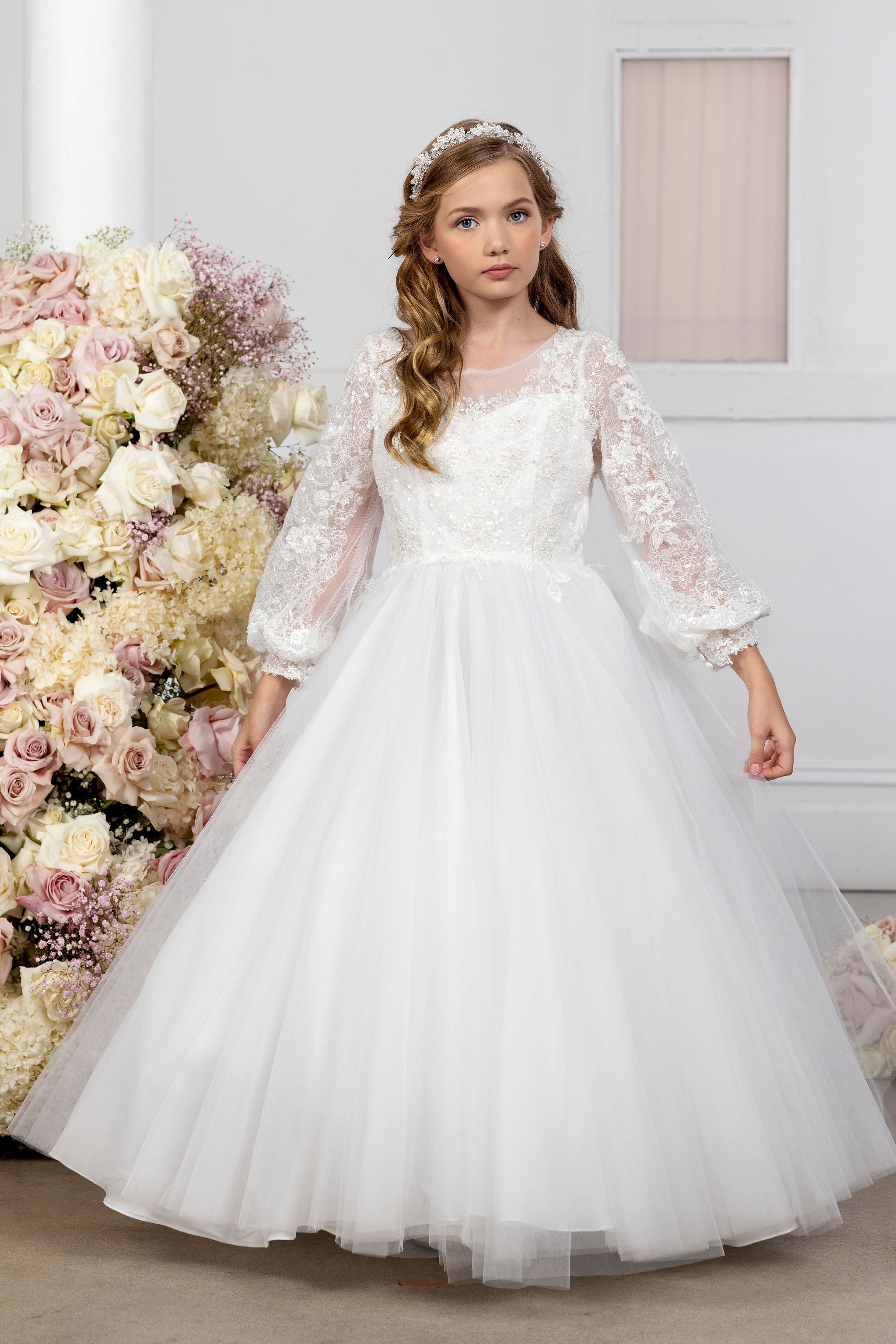 Beaded lace bodice with illusion neckline, long sleeves, and full tulle skirt.