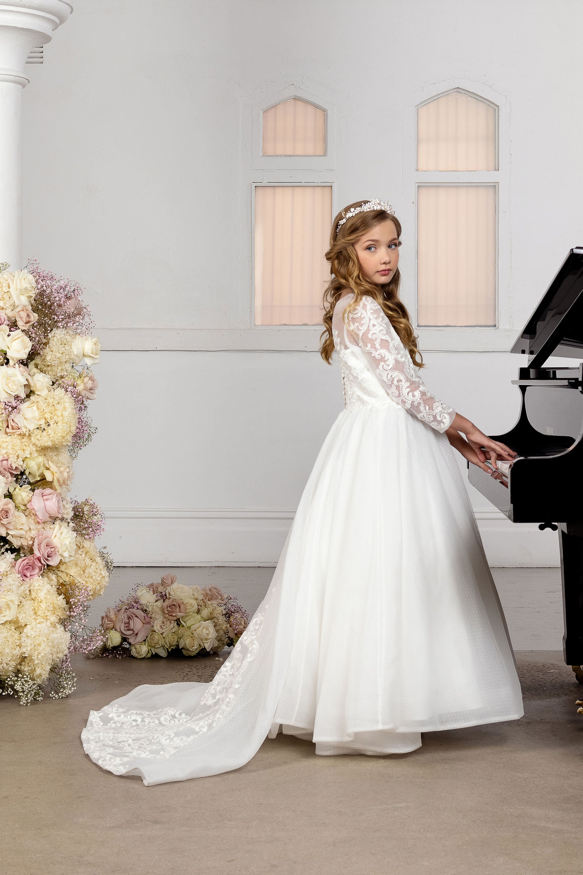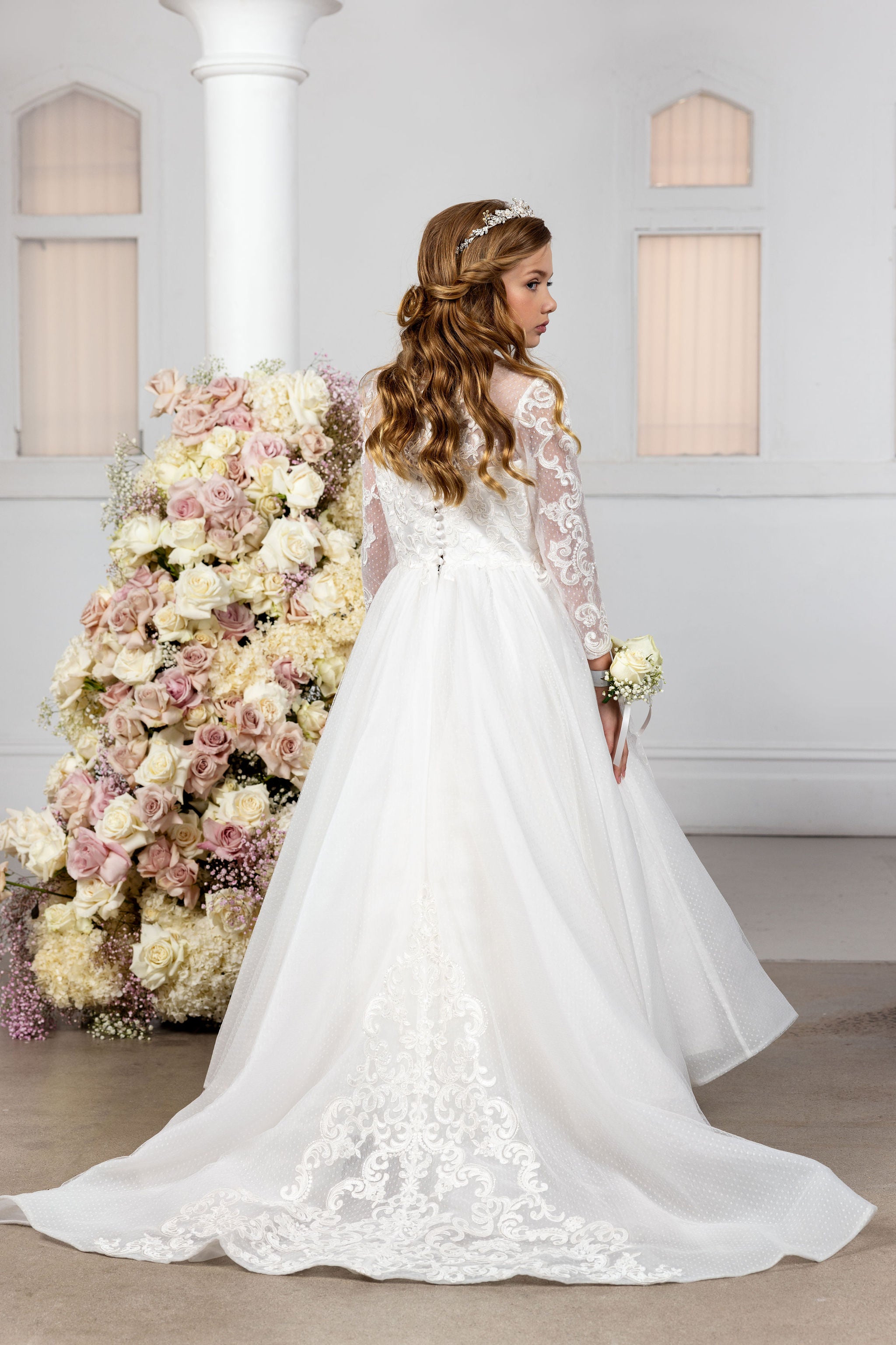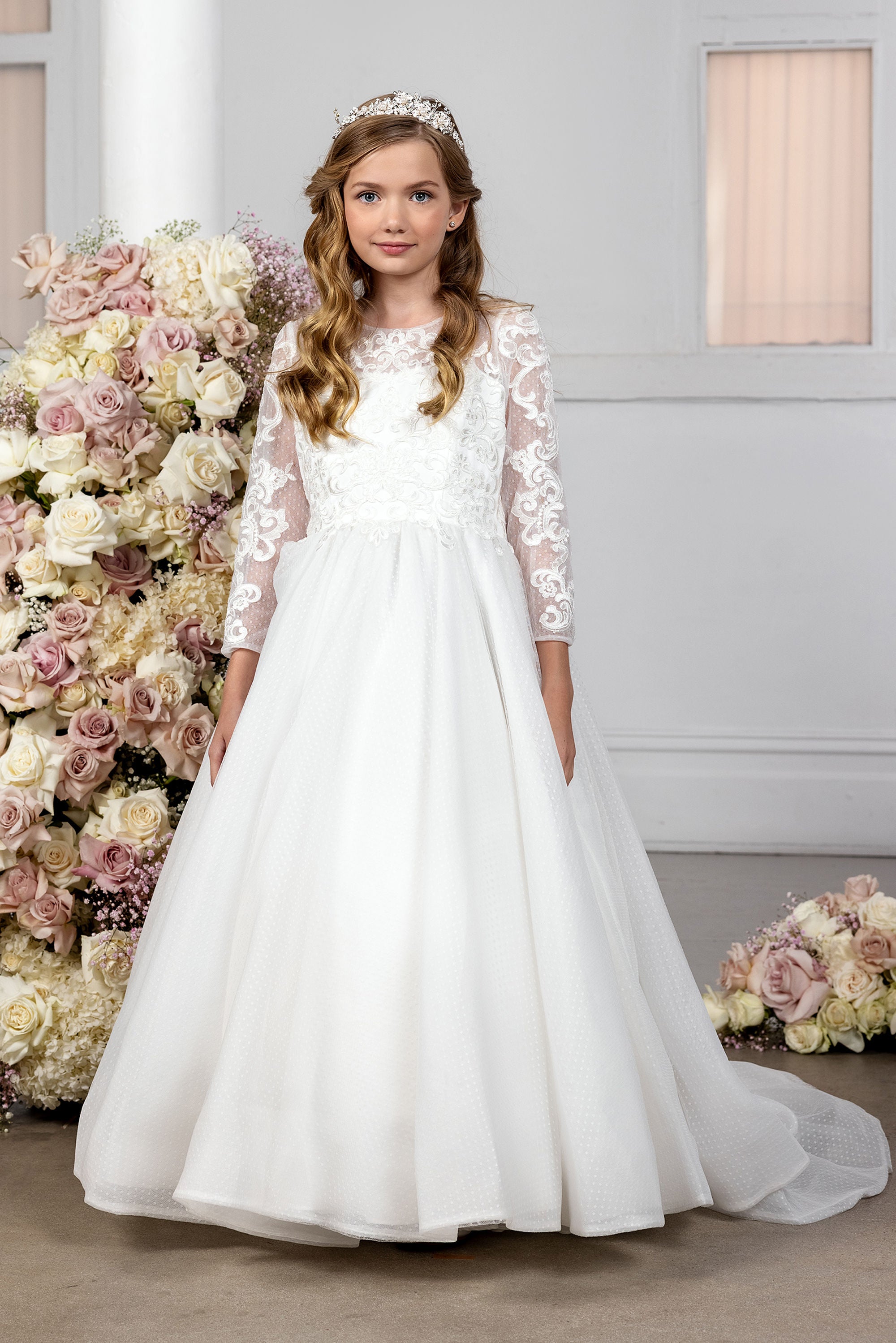 Lace bodice with illusion neckline, long sleeves, and floor length skirt with train. The dress has a polka-dot tulle outer layer.