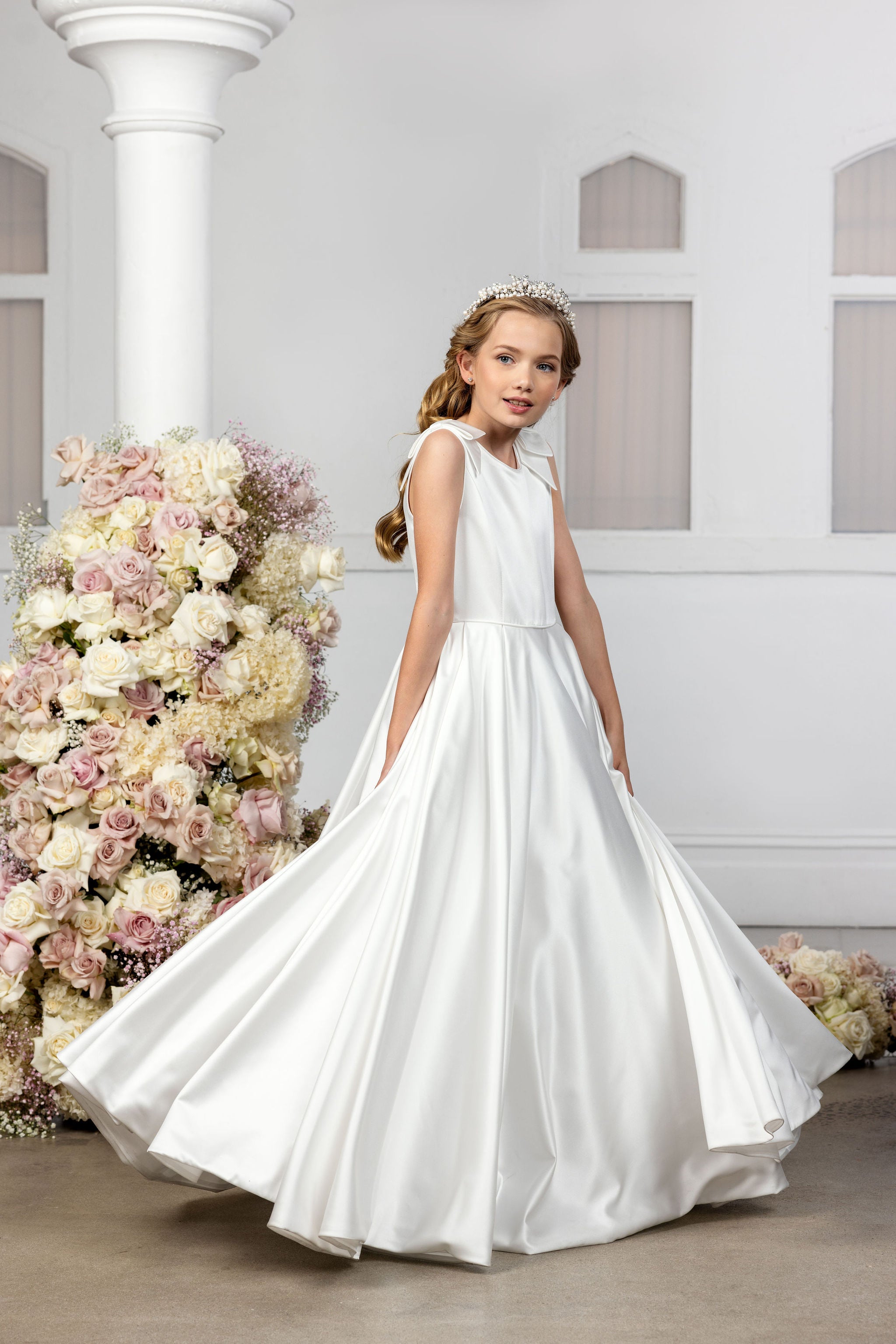 Stunning satin dress with bows on the shoulder and box pleat skirt.