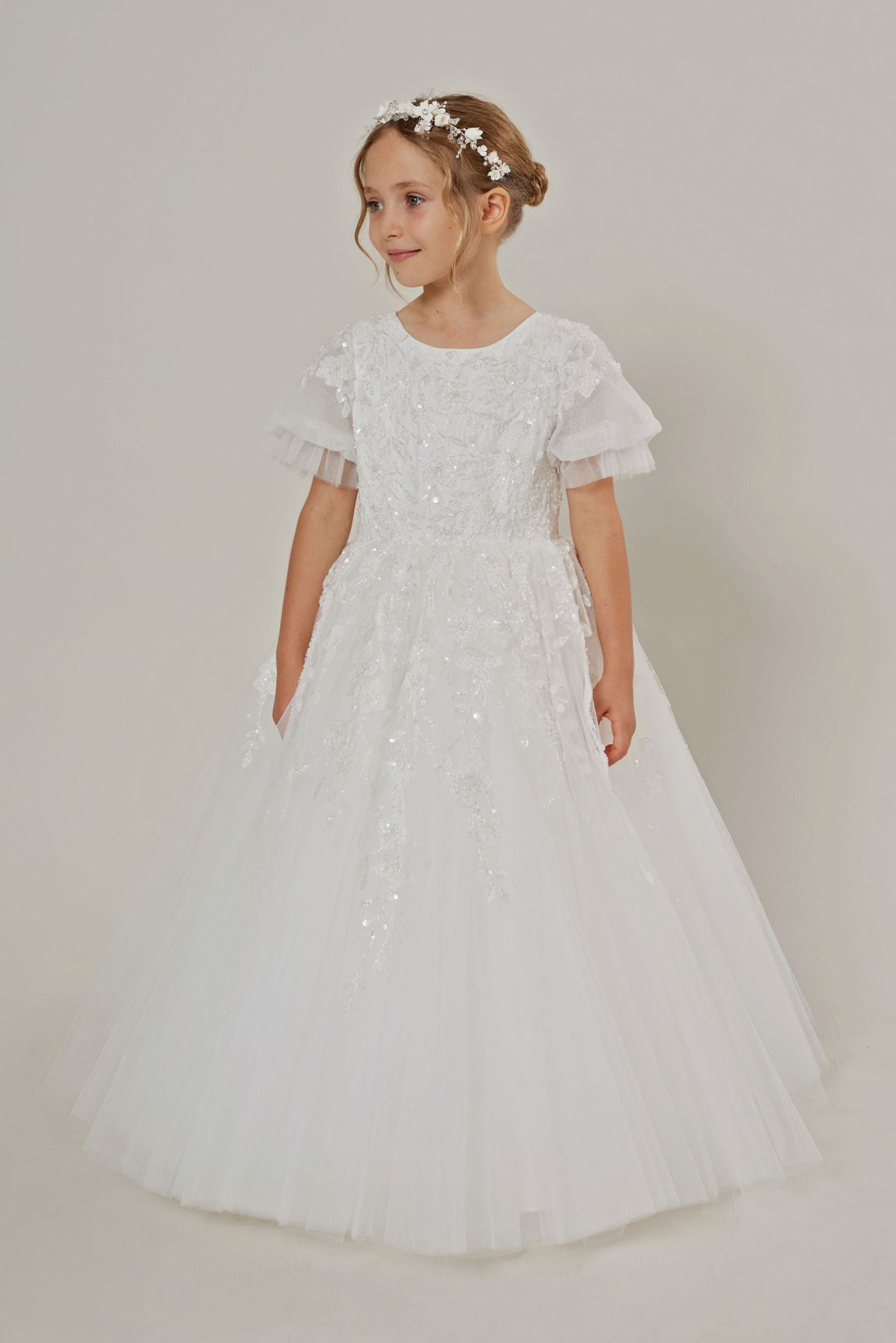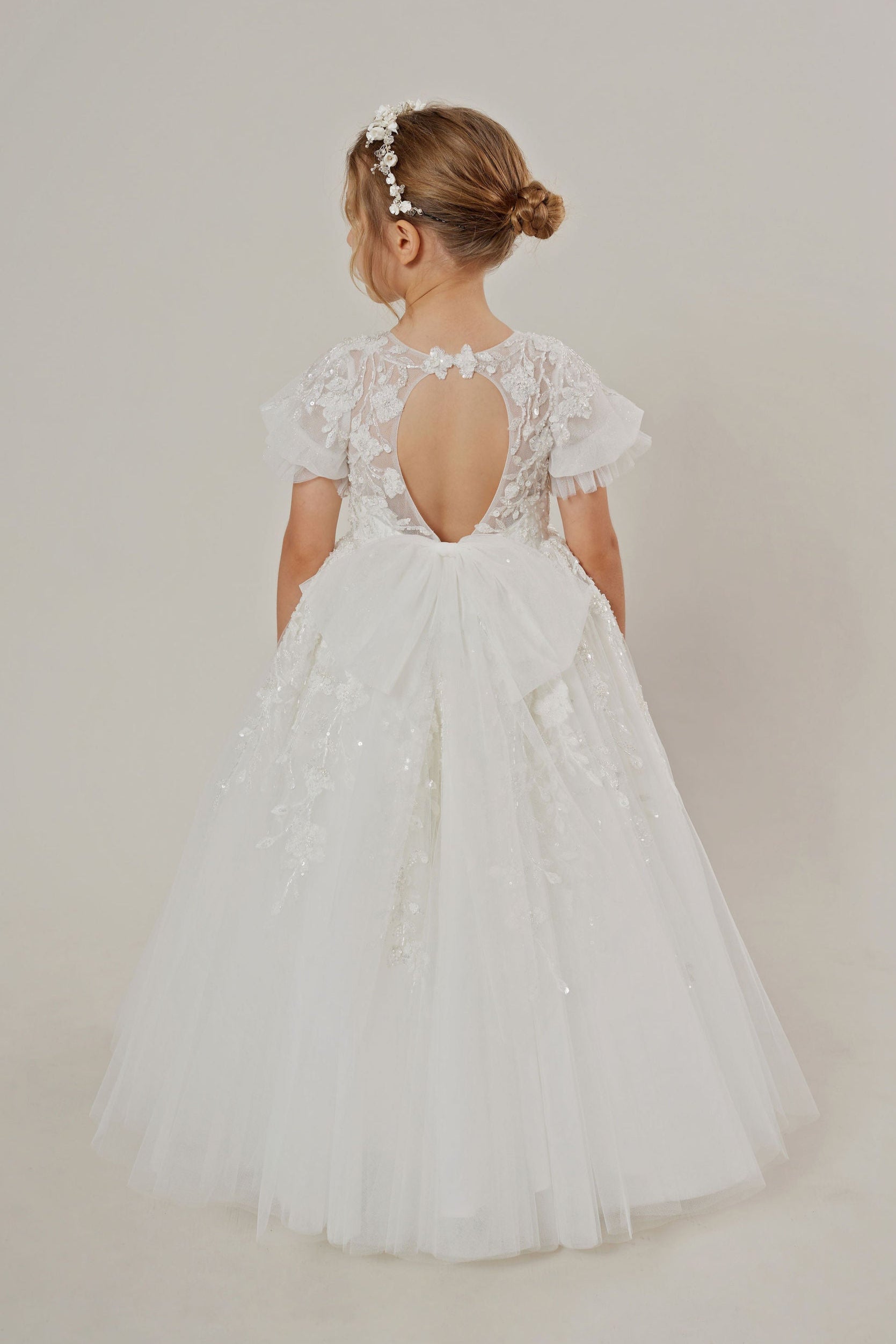 Amazing dress with luxe beaded lace bodice with open back, full tulle skirt and removable bow.