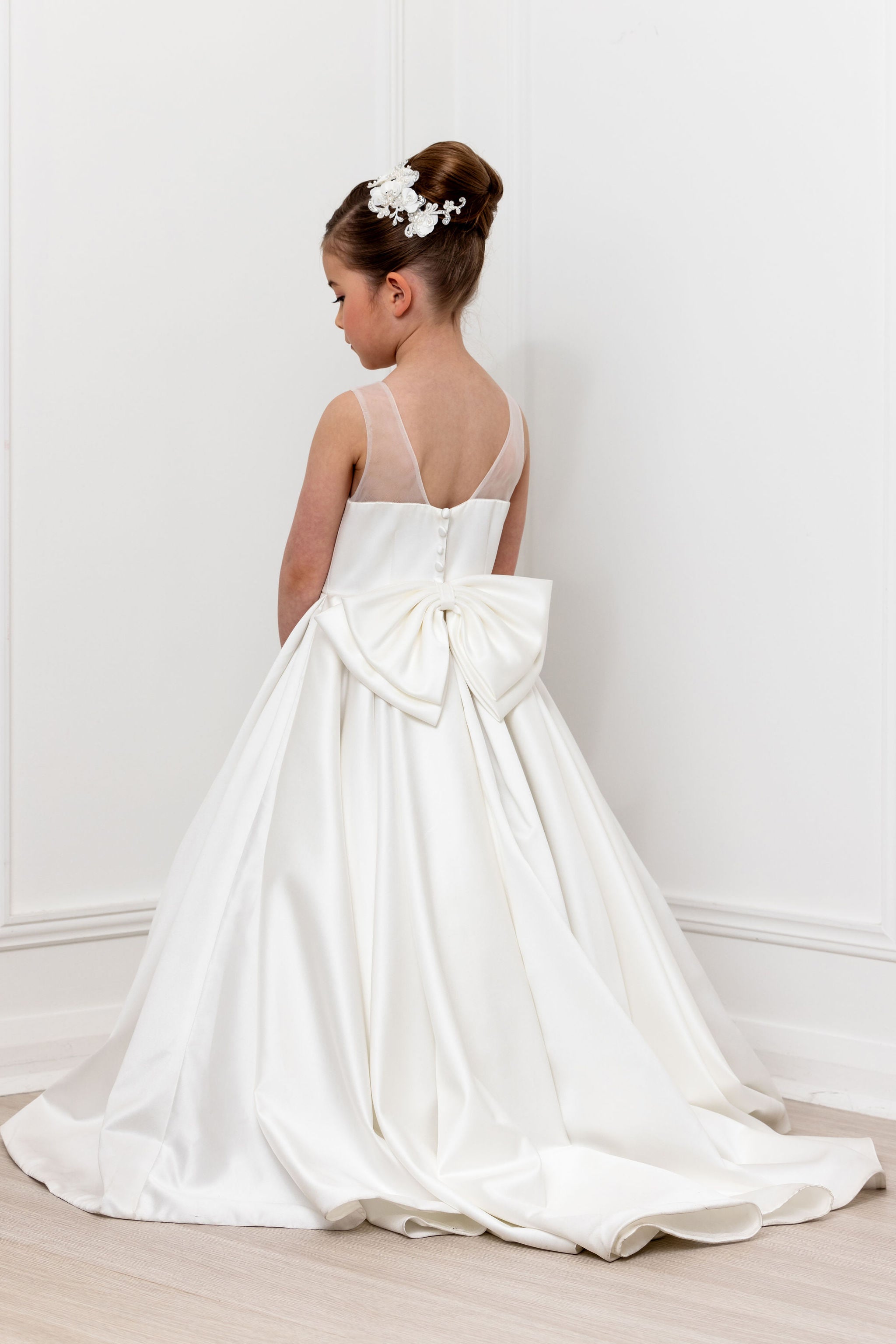 The gorgeous dress has a box pleat satin skirt, illusion neckline, bow on the back, and mini train.