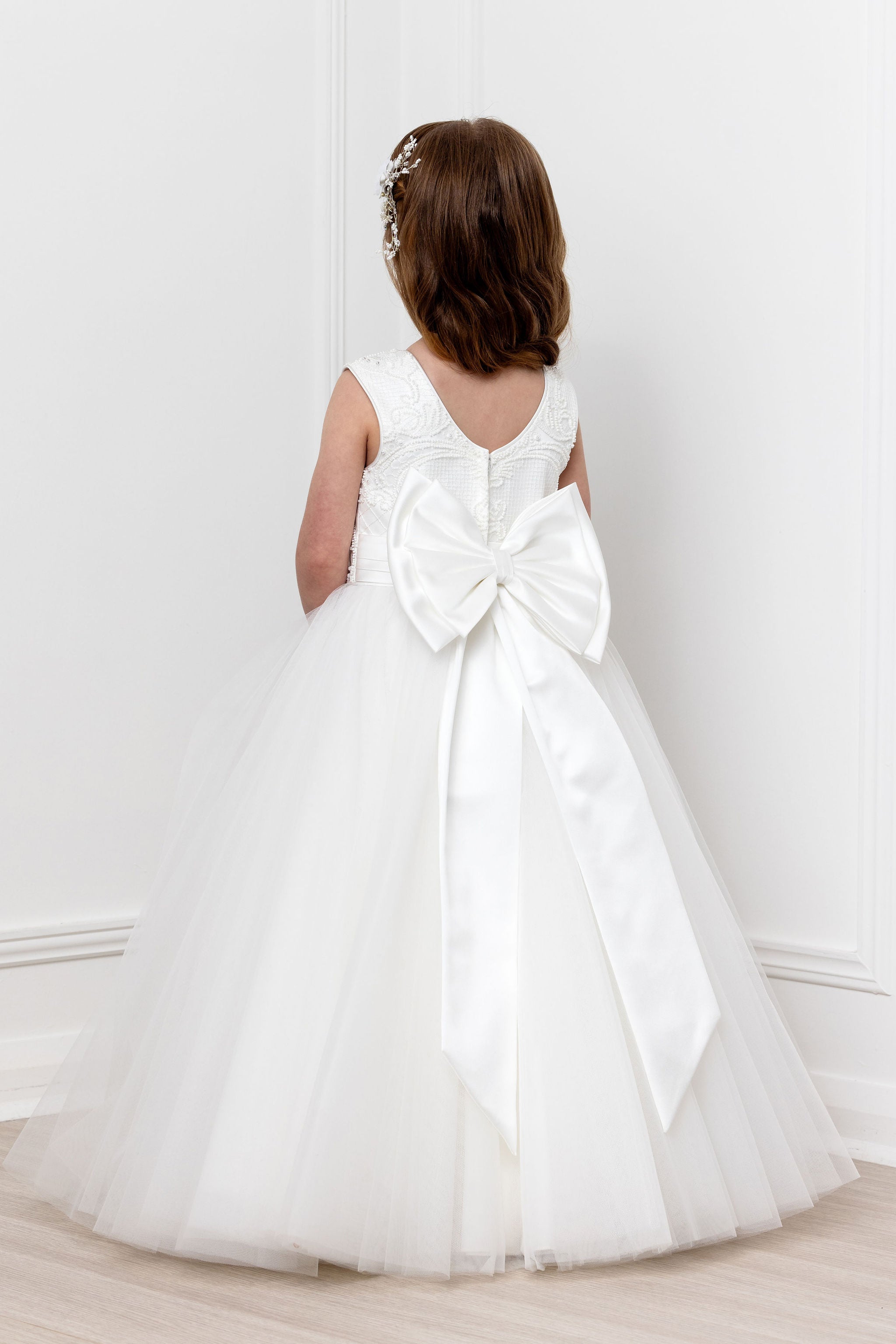 The dress has a gorgeous beaded lace bodice, full tulle skirt, and magnificent bow on the back.