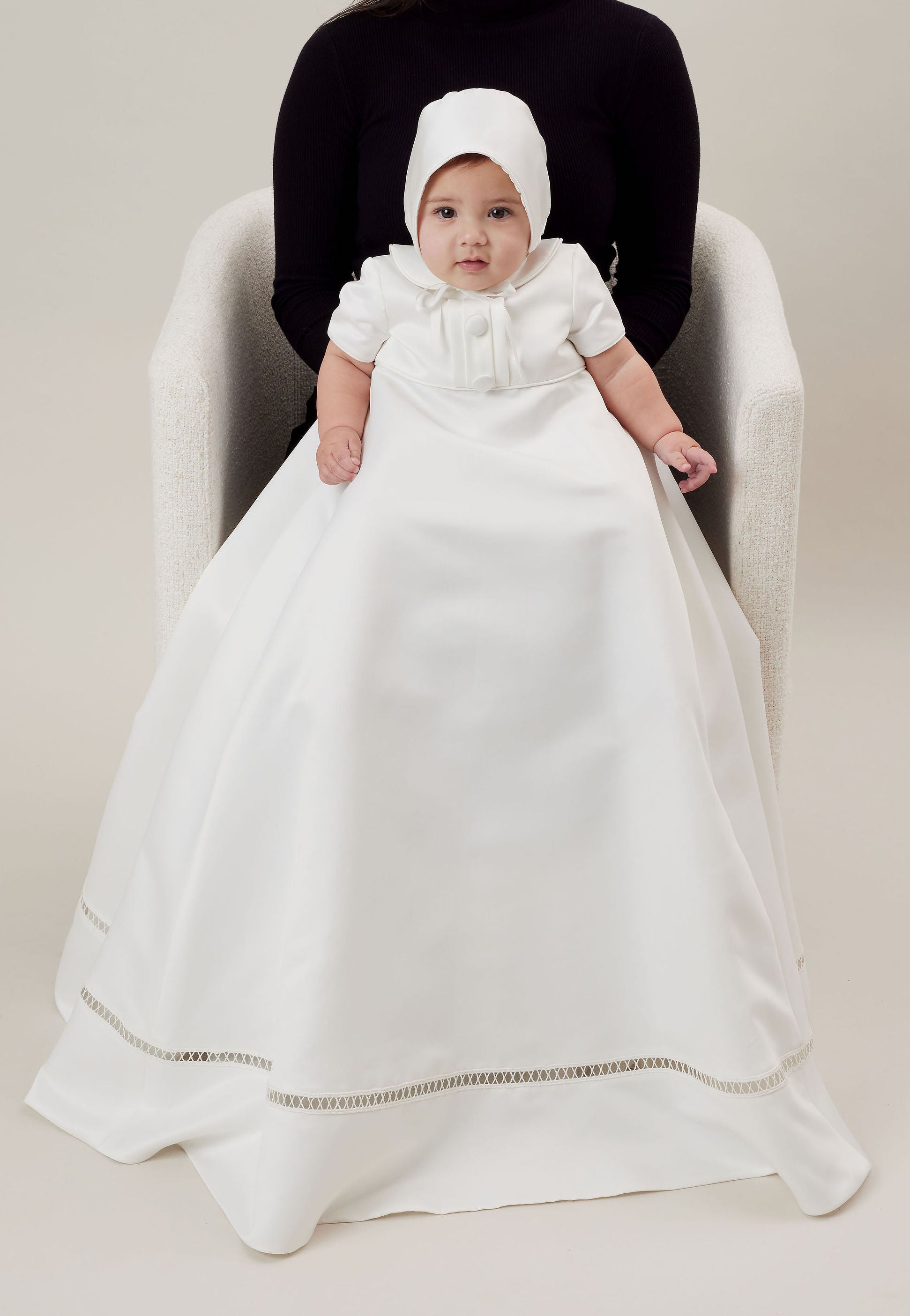 An elegant boy's Christening gown. The gown features a Peter Pan collar, button detail on the bodice, and a stylish trim insert towards the bottom of the gown.
