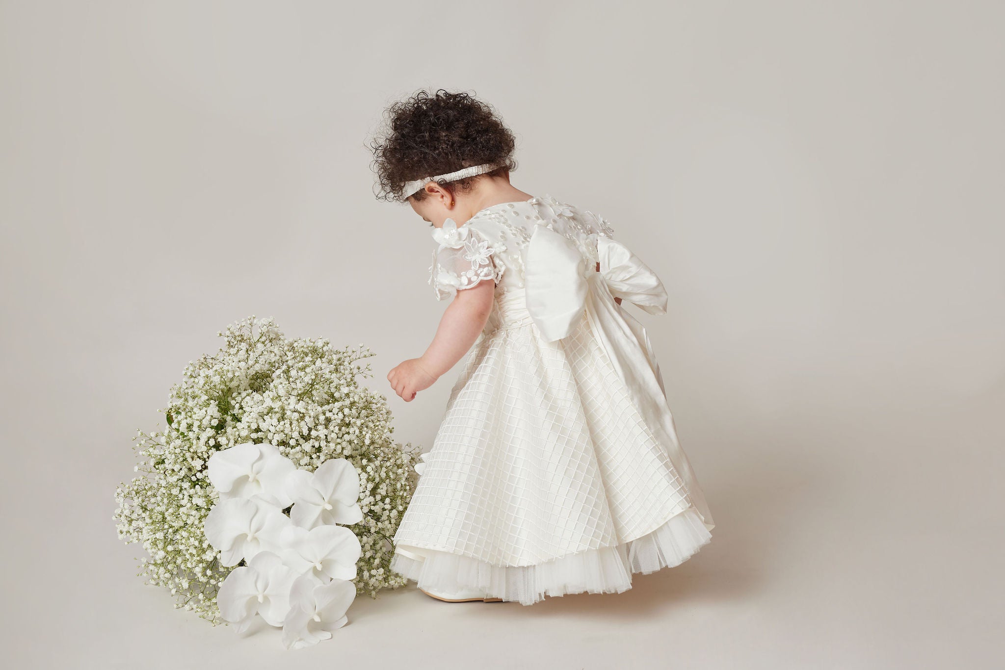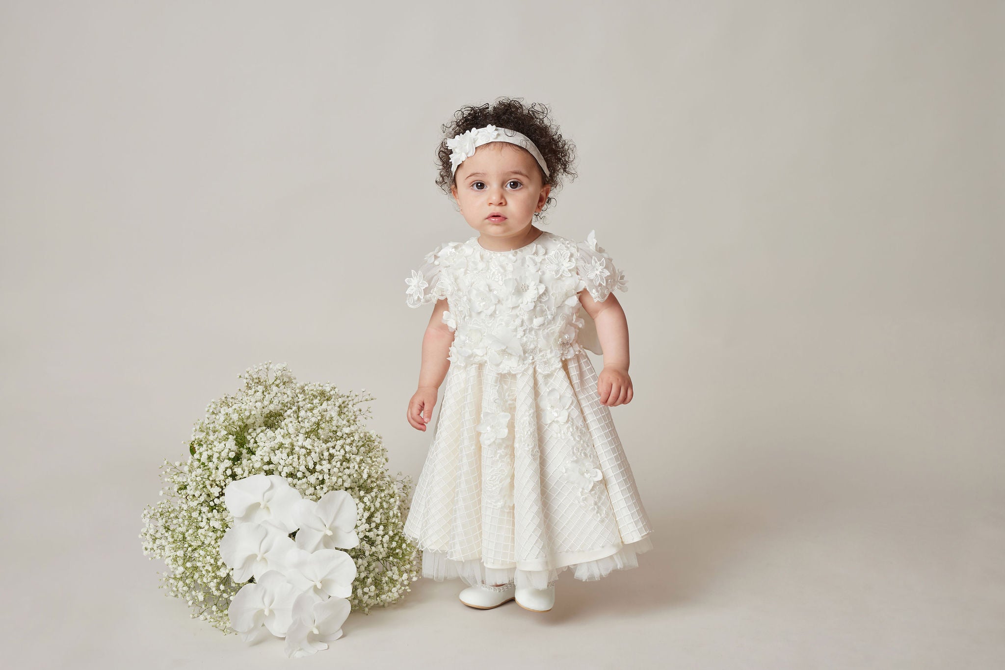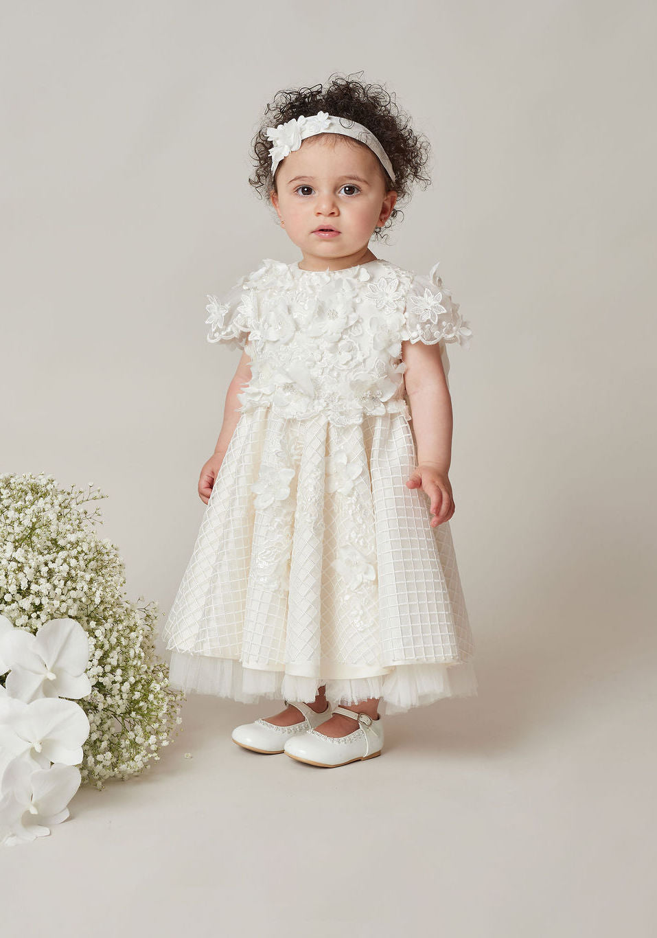 This sweet dress is made from 3D floral lace with pearl details and criss-cross lace skirt. The dress has a soft tulle underlay and silk lining. Franca has cap sleeves, pearl buttons, and gorgeous bow at the back.