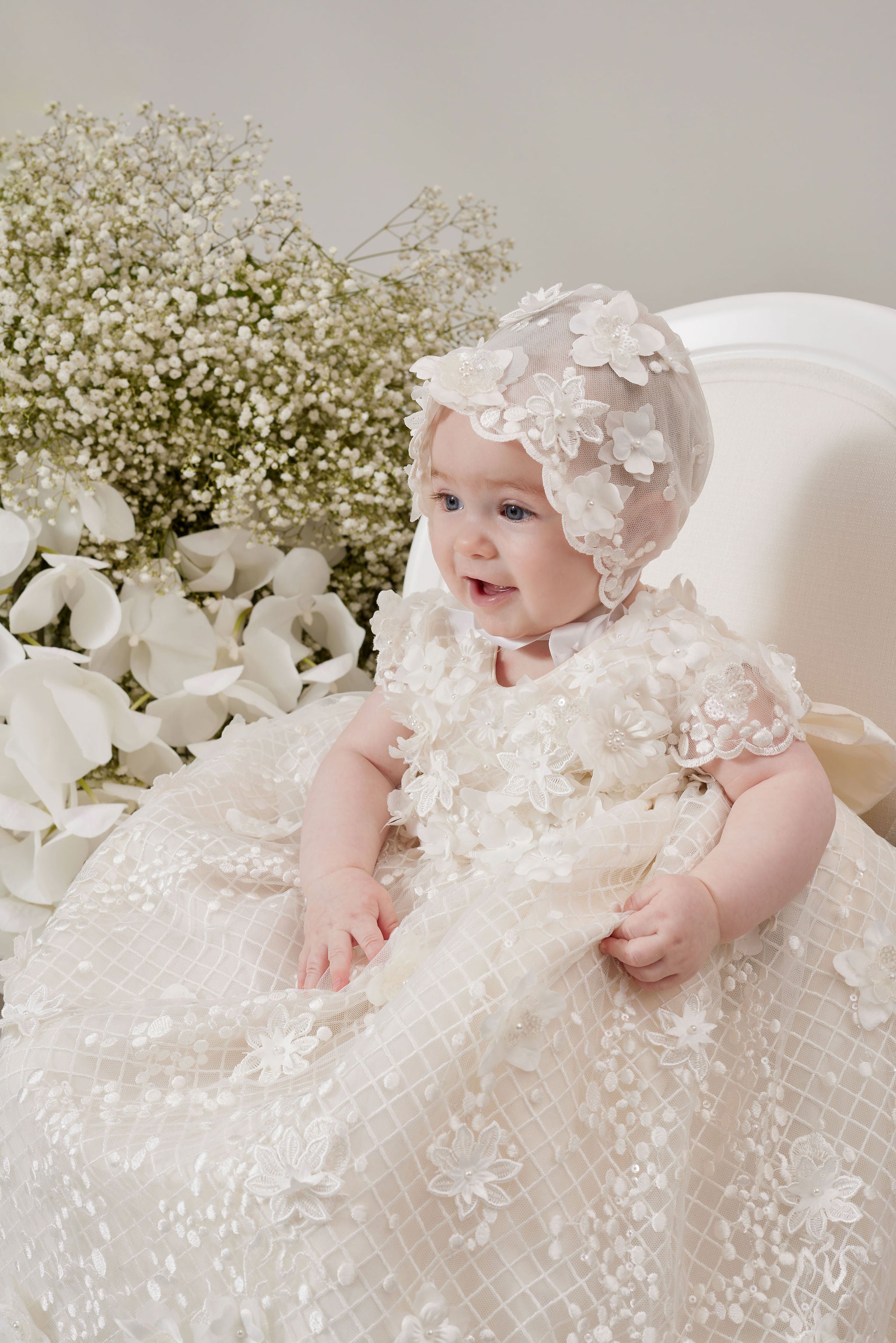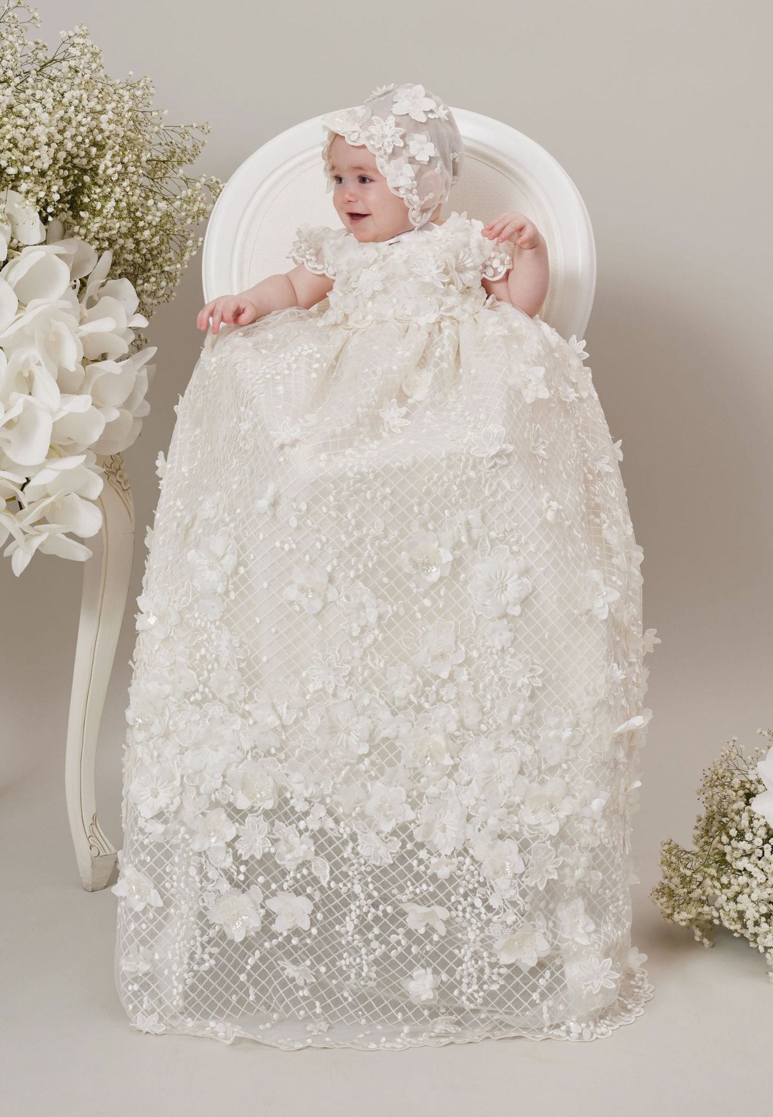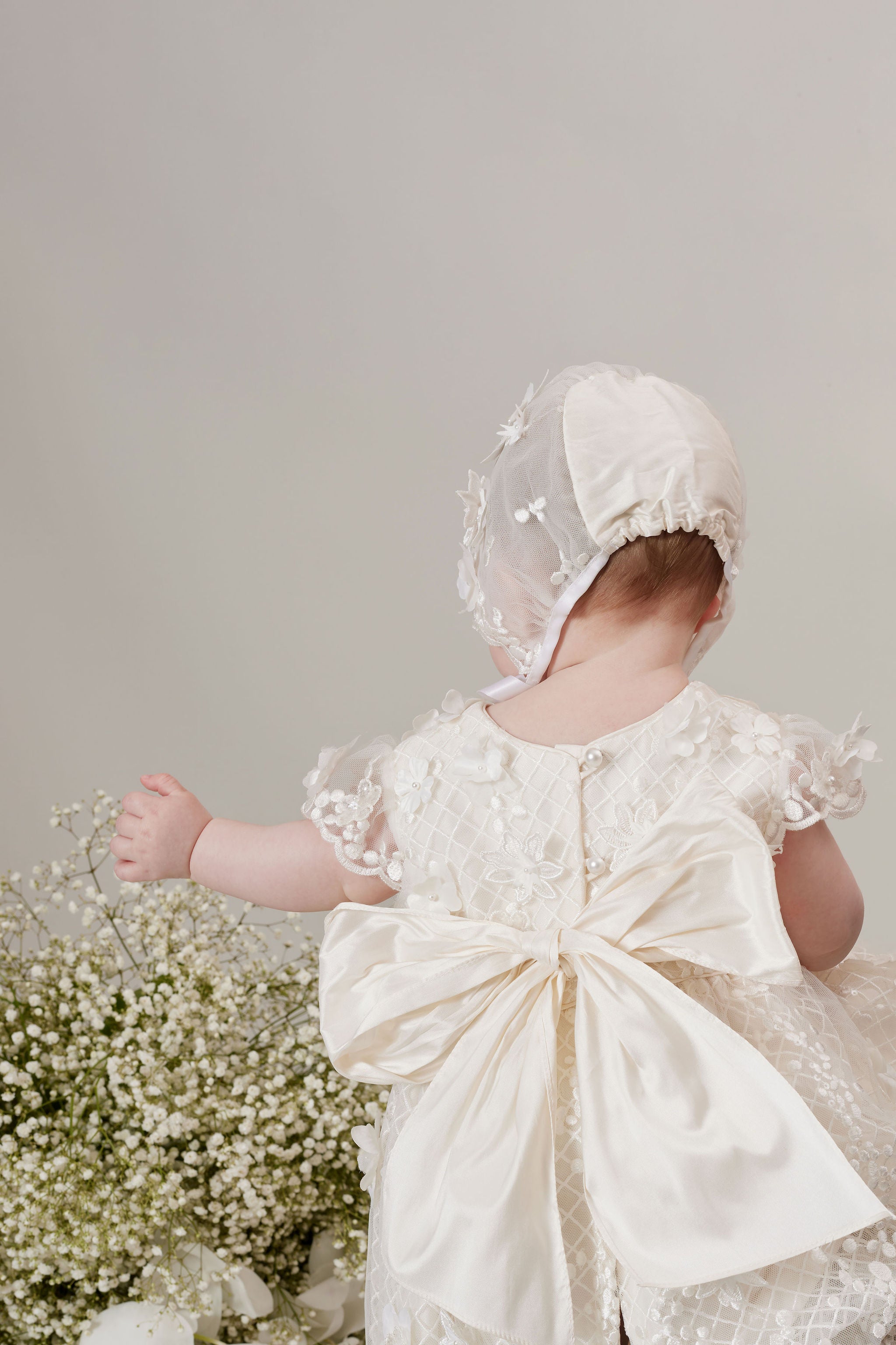 The Gown is crated from a 3D floral lace with pearl details. The gown has a criss-cross lace underlay and silk lining. The dress has cap sleeves, pearl buttons, and a stunning silk bow sash at the back.