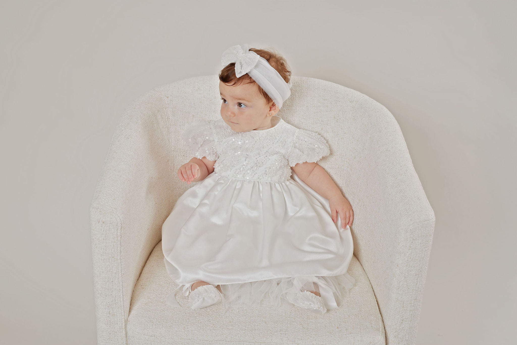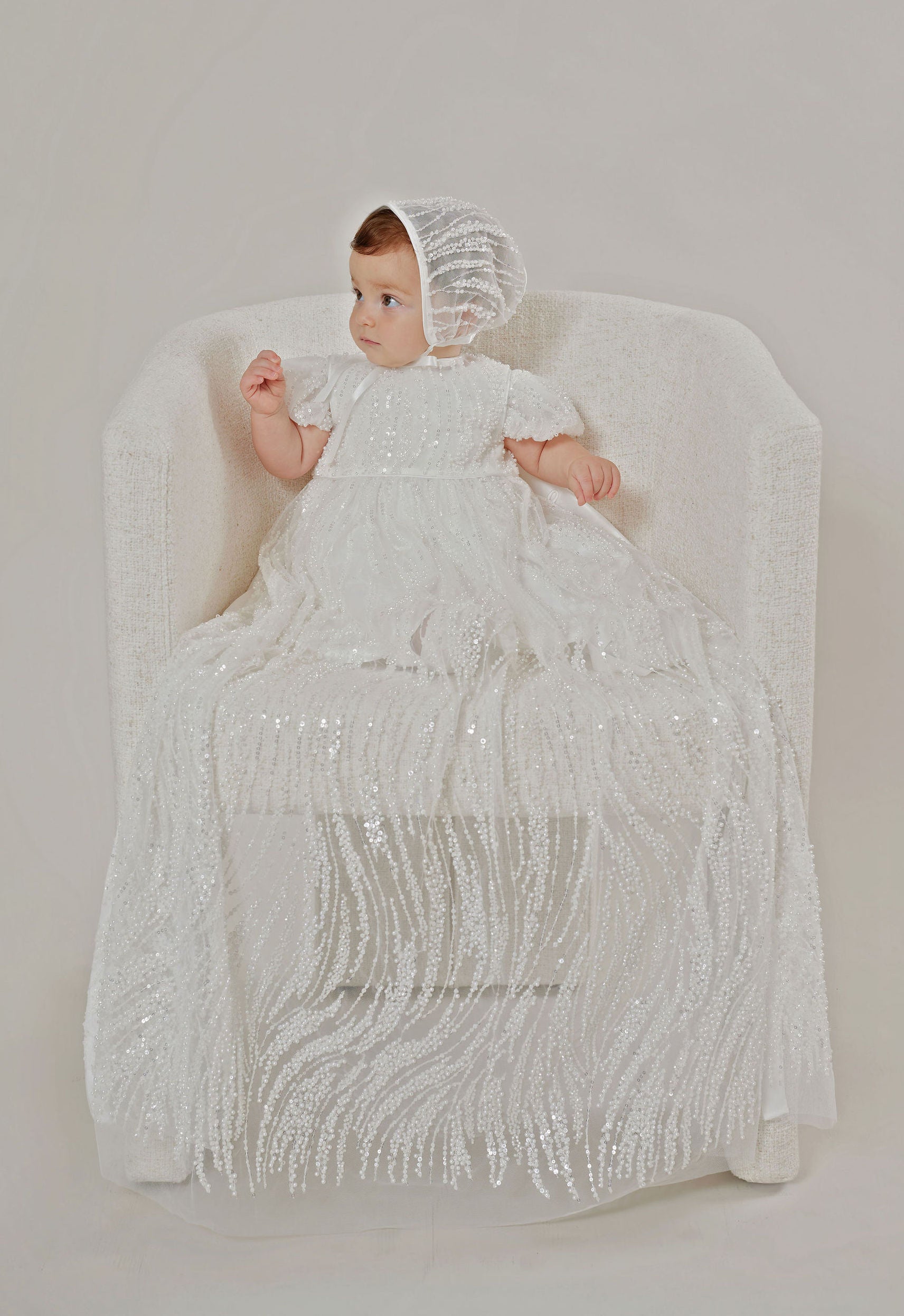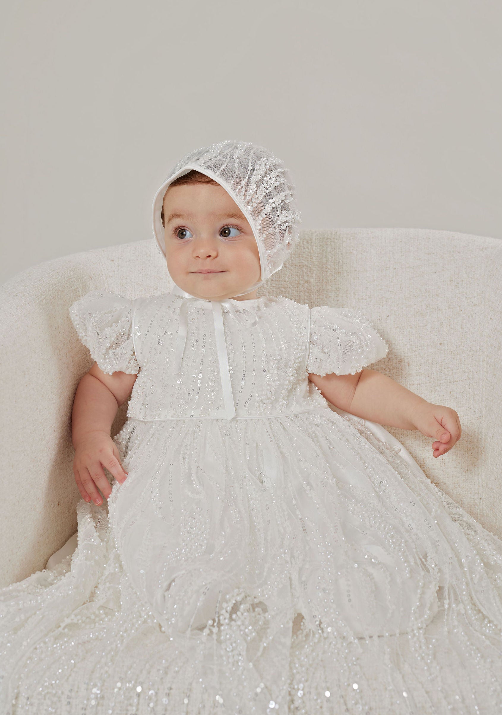 Gorgeous pini set crafted from a fine pearl and sequin lace. The set includes removable lace pinafore, dress, bonnet & booties.