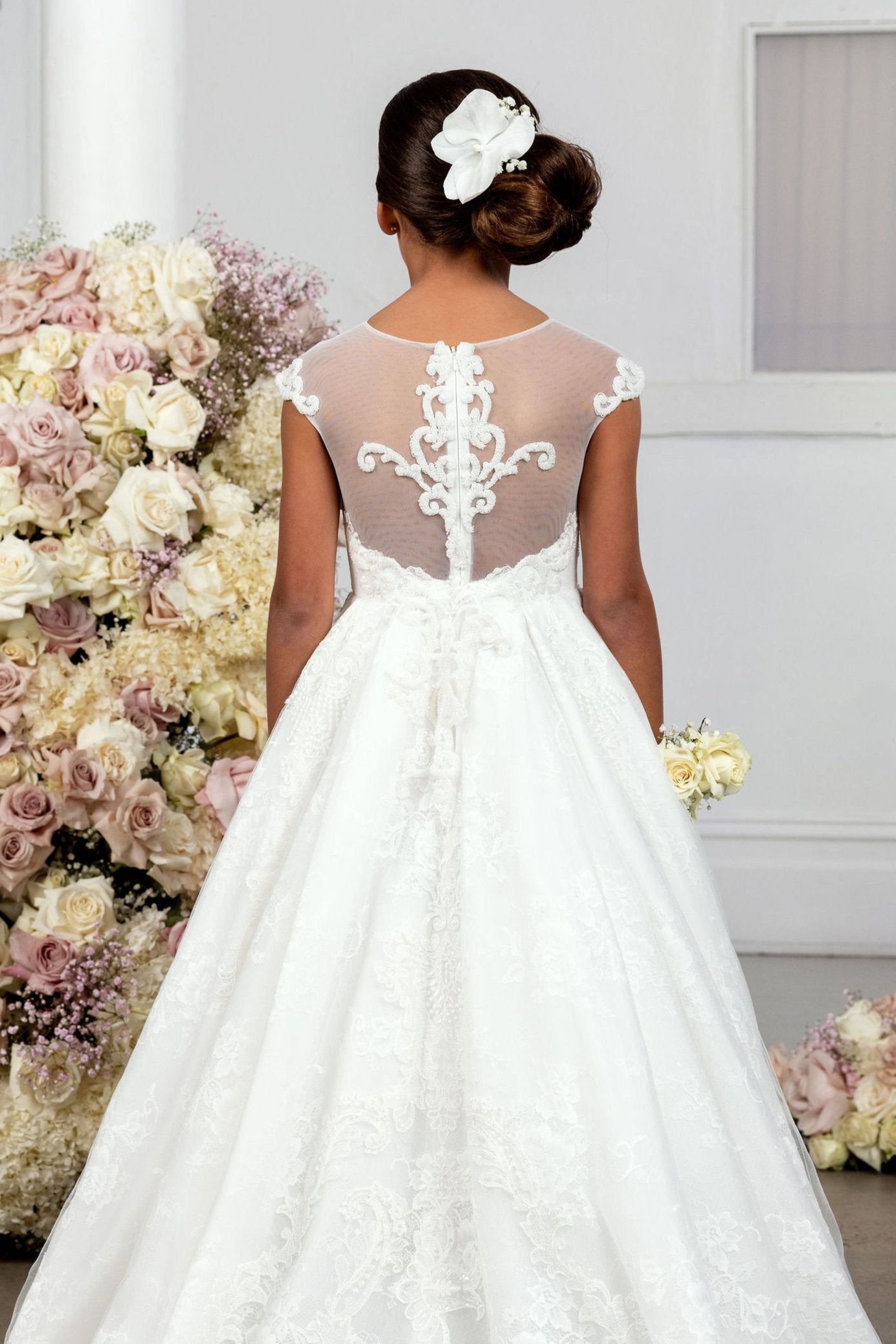 This spectacular dress features a hand beaded lace bodice, illusion neckline with delicate mesh and feature back, and floor length full skirt.
