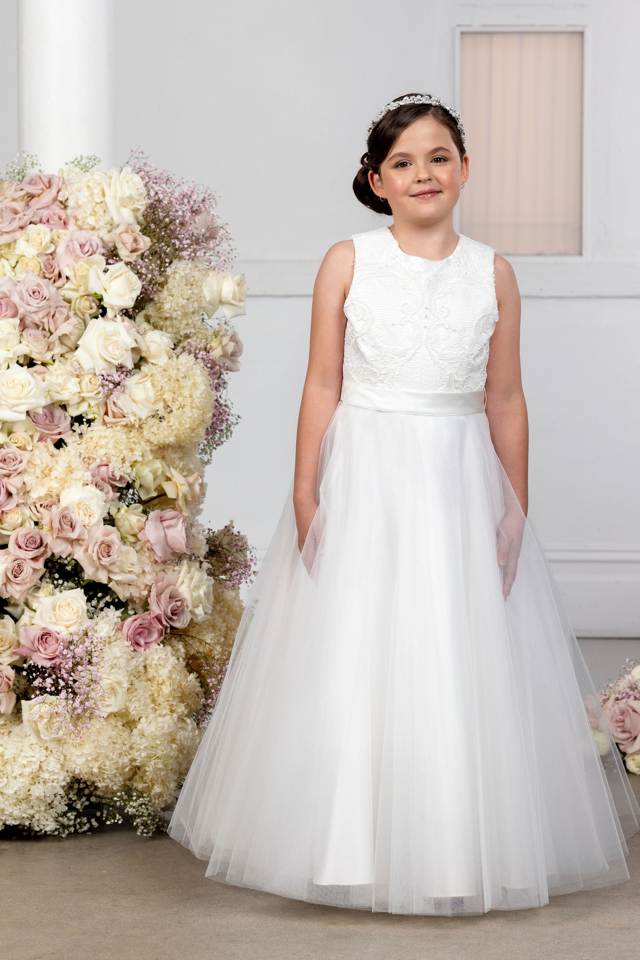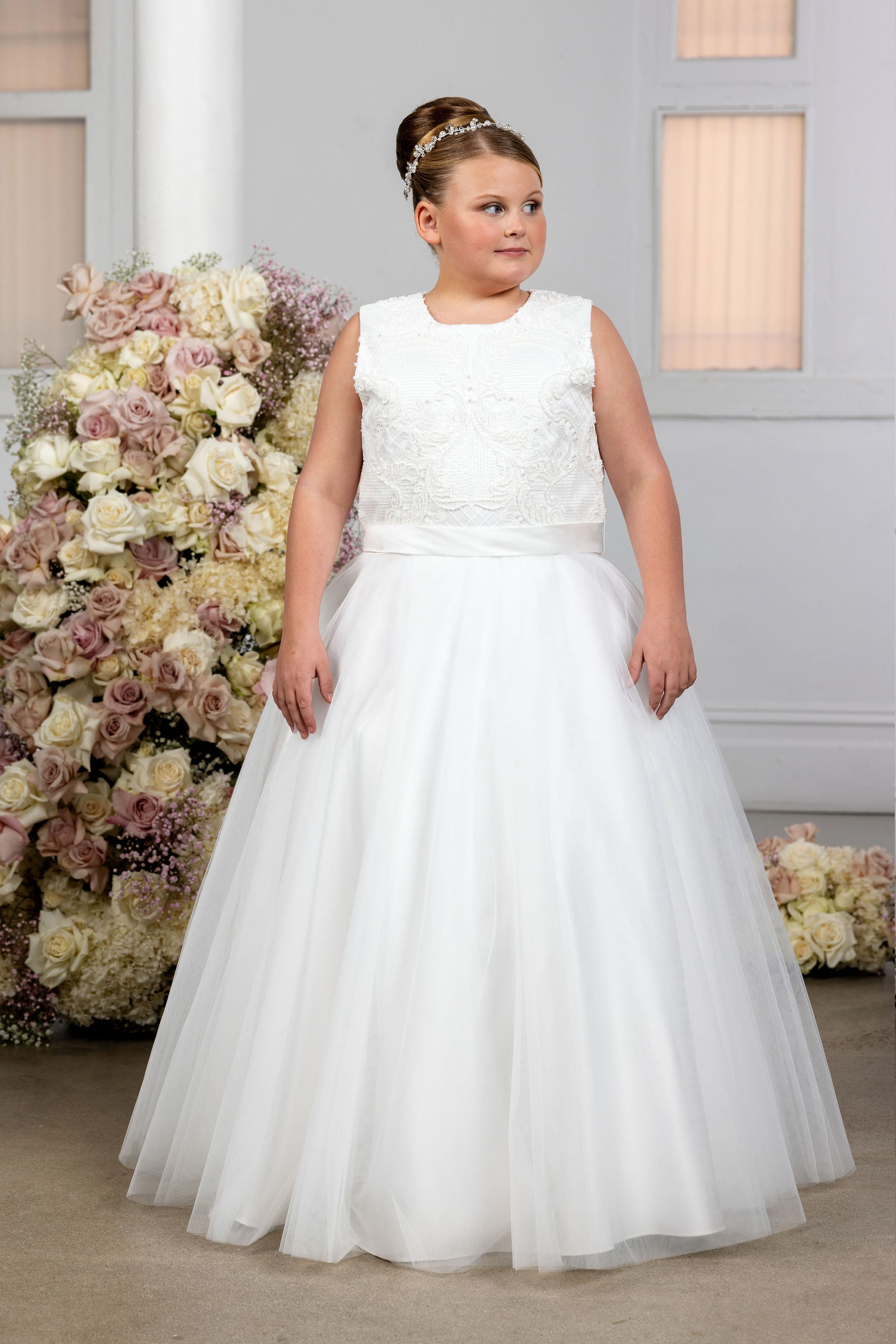 Beaded lace bodice with A-line tulle skirt.